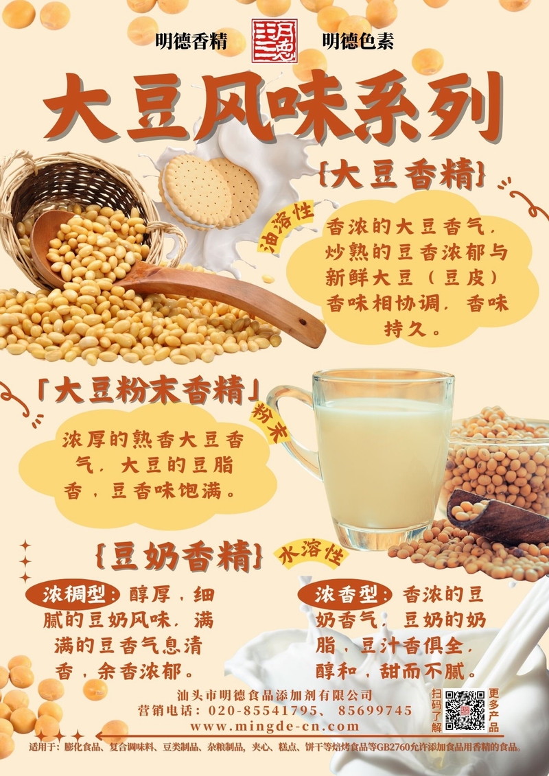 如需獲取不同版本風味樣品或配方方案,歡迎聯系明德團隊。我們致力于為食品工廠提供真實、安全、高性價比的香精解決方案。汕頭市明德食品添加劑有限公司推出的大豆風味系列香精,覆蓋大豆香精、大豆粉末香精、豆奶香精等多種調性,風味真實,留香穩定,適用于膨化休閑、復合調味、豆制品及飲料等B端工廠,幫助快速打造具有記憶點的大豆類風味。
