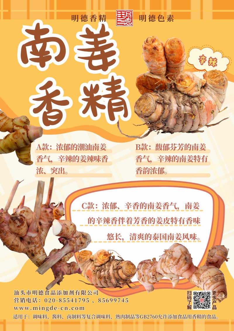 明德南姜香精 辛香鮮明 覆蓋鹵醬腌制與東南亞風味汕頭市明德食品添加劑有限公司推出的南姜主題香精,覆蓋多種品類,風味真實、留香穩定,適用于醬料、腌制料、調理食品、肉制品、鹵制品、熟肉制品、復合調味等B端應用。
