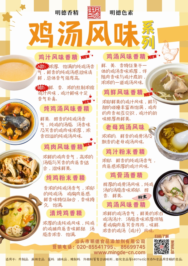 明德雞湯風味香精 濃郁鮮香 還原地道雞湯本味汕頭市明德食品添加劑有限公司的雞湯風味香精系列,涵蓋雞汁、雞湯、雞鮮風味、老母雞湯、雞肉風味、雞粉末、雞骨湯、清燉雞等多種品類。產品具備真實的雞肉鮮香、湯香、油香與骨香特征,能夠為醬料、調味品、肉制品、腌制料及復合調味料等B端應用提供穩(wěn)定、濃郁的雞湯風味解決方案,幫助工廠快速打造風味醇厚、回味悠長的雞香產品。